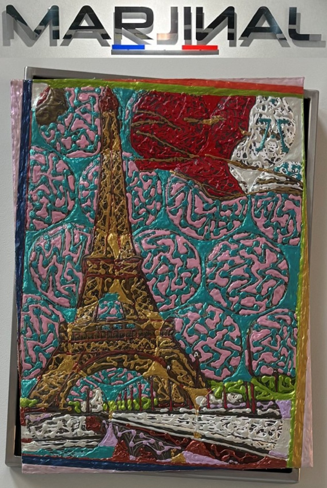 EIFFEL PISE 42x32 Acylique/Toile 'Série Bulles' montée sur Sculpture Chassis-Décalé-Marjinal Inox Droit INPI-2025 By MARJINAL Artiste Peintre Décalé Intégral Français.