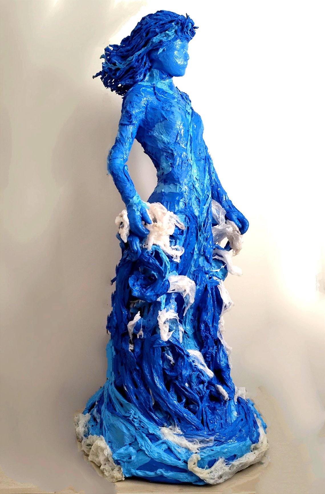 Matsu, la Dea dei Mari Matsu, "la fanciulla silenziosa" nata umana, viene poi venerata nella tradizione orientale come Dea dei mari che calma le tempeste per via della sua capacità di intuire il buono e cattivo tempo, e non solo. Qui viene reinterpretata spogliata degli abiti della tradizione per divenire lei stessa mare. Statua realizzata esclusivamente con film plastici colorati, in assenza di vernici applicate, ma di colore proprio del materiale, lavorazione con cannello a fiamma libera e phon ad alta temperatura. Misure statua Altezza 1,80m Larghezza 1m Profondita' 80cm