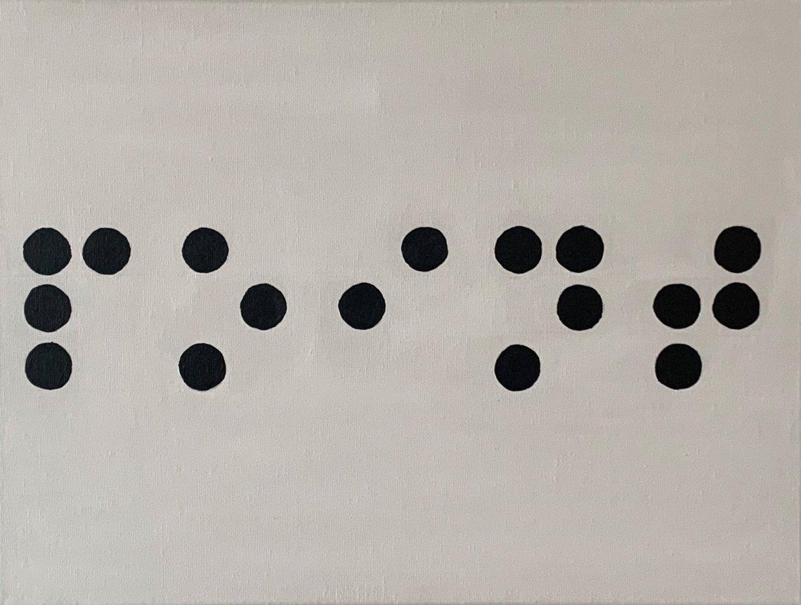 "Can’t see the point" is a conceptual piece exploring the limits of perception and the duality of meaning. The word point (both "meaning" and "dot") is rendered on a flat canvas as a series of black circles replicating Braille. However, the tactile quality essential for reading Braille is absent: a blind person cannot feel the inscription, and a sighted viewer cannot read it. As a result, no one "sees the point" - neither literally nor metaphorically.