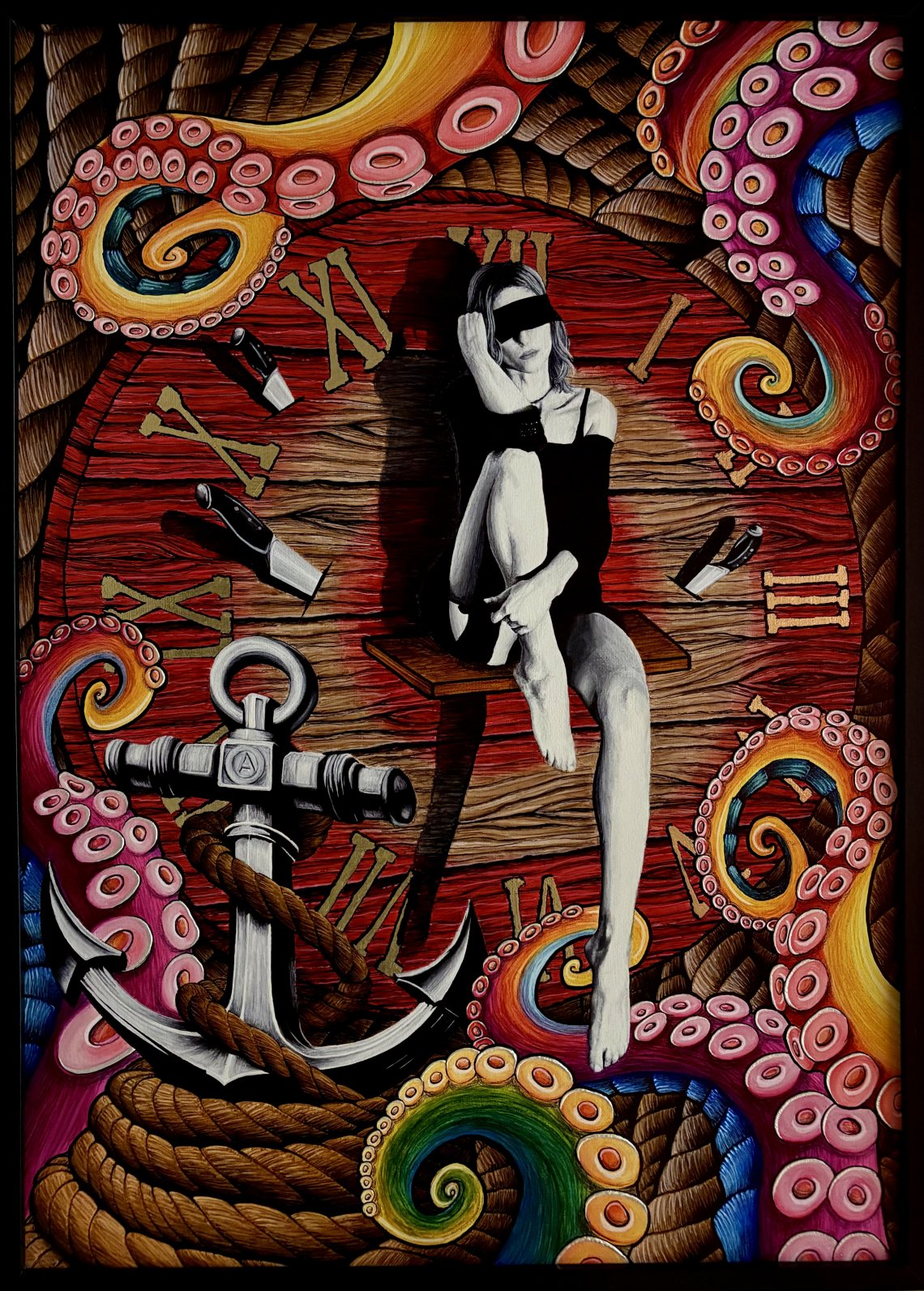 Testo accompagnatorio Lame nasce da un’esperienza vissuta a doppio filo, tra il prendersi cura e il riconoscersi. Da anni accompagno mio figlio nel suo percorso con la neurodivergenza, imparando a stare accanto alle sue soglie sensoriali, al suo modo preciso e vulnerabile di abitare il mondo. Solo più tardi ho scoperto di condividere, in parte, quello stesso modo: con una diagnosi tardiva, ho iniziato a guardare la realtà anche da dentro. L’opera non offre spiegazioni, non cerca definizioni. È una soglia visiva: racconta cosa vuol dire abitare il troppo, il troppo stimolo, il troppo rumore, il troppo tempo. E la necessità, a volte, di restare immobili o di distogliere lo sguardo: non per fuga, ma per protezione. Il non guardare è un modo per non rompersi. Anche per questo la tela è trattata con un fondo lucido, reattivo alla luce. Se l’illuminazione è invadente, l’opera si appiattisce, si chiude. Per essere vista davvero, va cercata. Chiede movimento, chiede attenzione distribuita. Chiede rispetto. Lame è il racconto silenzioso di chi resta fermo, non per paura, ma per amore. “Lame” è parte di un ciclo di opere già sviluppate, che esplora il rapporto tra neurodivergenze, percezione e identità. ⸻ Dettagli tecnici •Tecnica: Pennarelli alcolici su supporto telato •Dimensioni: 50 × 70 cm •Anno: 2025