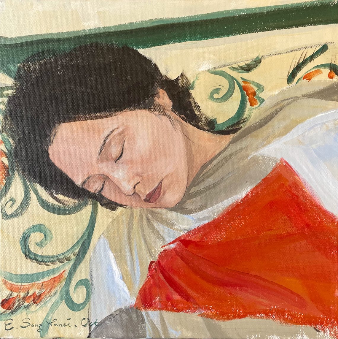 The painting depicts a woman with her eyes closed, her expression relaxed, casually wrapped in a thin colored blanket, looking languid and hazy, as beautiful as the sun reflecting from a curtain on a summer afternoon. The quiet and graceful tension between her eyebrows and eyes evokes infinite reverie, and the lines of her facial features and face outline the divine femininity, revealing the power of life force redemption.
