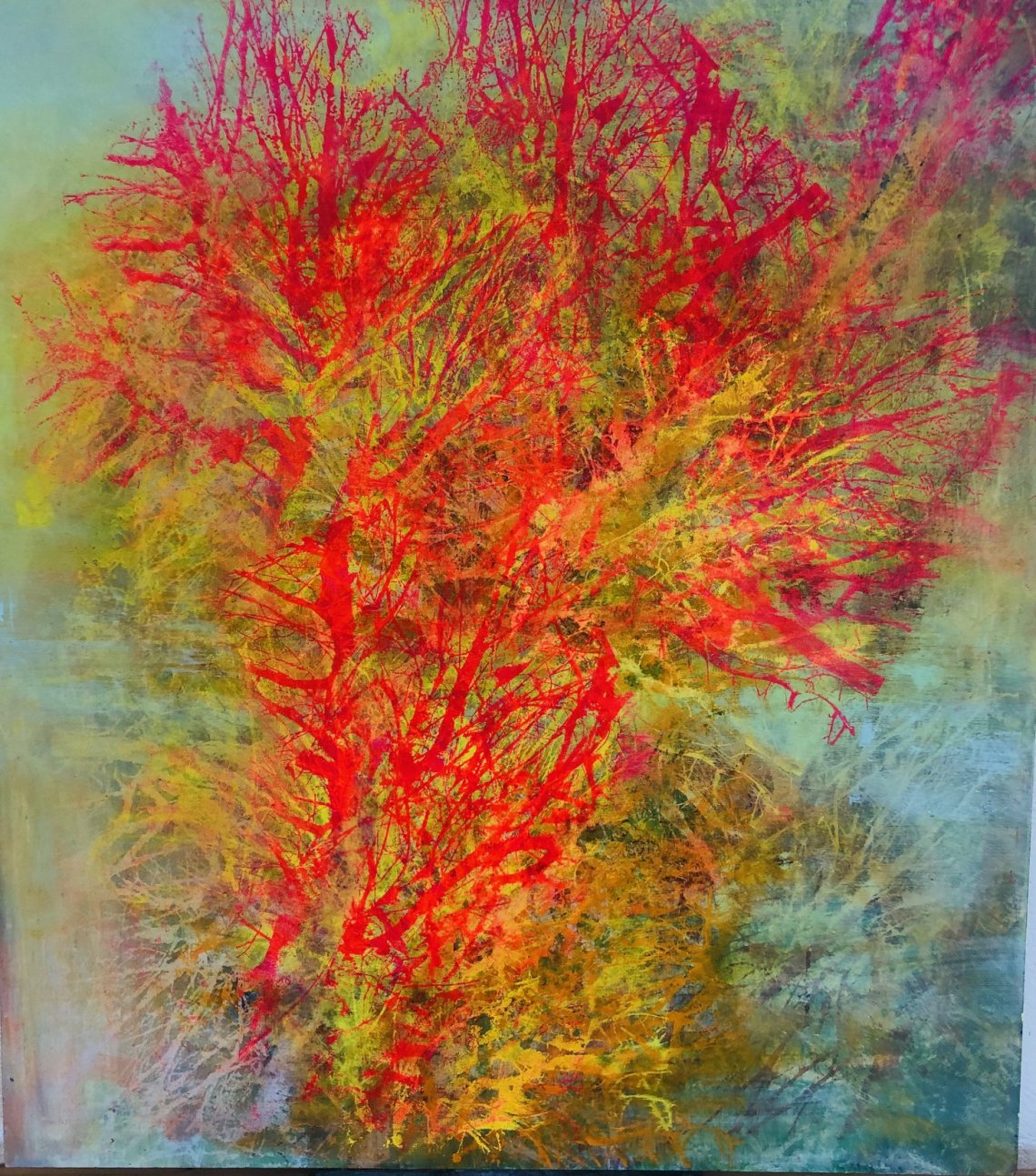 Siebdruck 110x100 cm auf einer Holzplatte. Was einst ein Fotografierter Baum war, ist nun zu einer bunten Unterwasserwelt mutiert. Die Feuerkoralle leuchtet kraftvoll vom Meeresboden und läst uns von einer sauberen und intakten Meereswelt träumen.