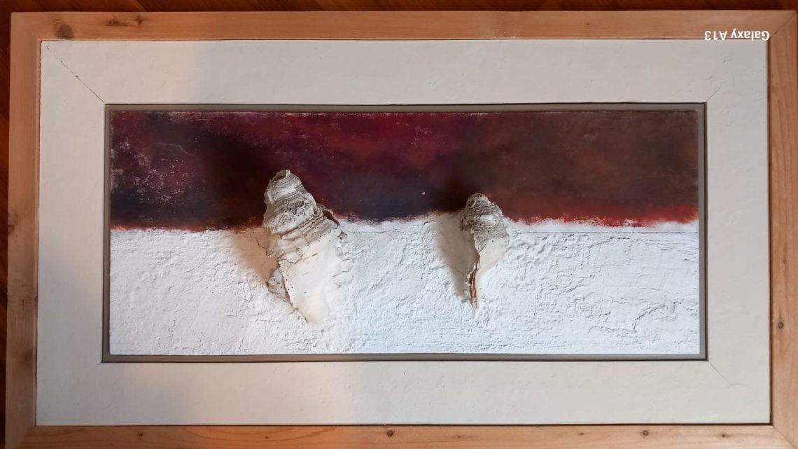 Pittura a olio e tecnica mista su compensato con conchiglie. Dimensioni senza cornice 80x33.