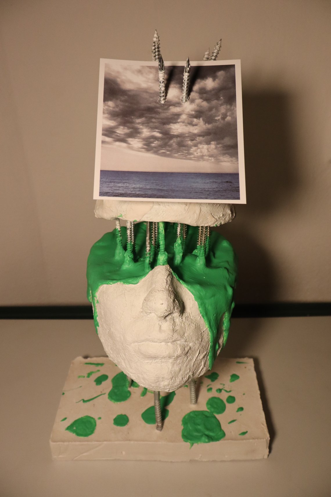 Above the head floats a photograph, a serene seascape under a cloudy sky, impaled yet elevated. It depicts a place of longing. On one hand, it reflects the imagery promoted by idealized figures in media and apps, offering rest and mindfulness while living performative lives. On the other, it stands in sharp contrast to the sculpture below: the sea and sky demand nothing. They have always been there — still, grounding, untouched by technology.