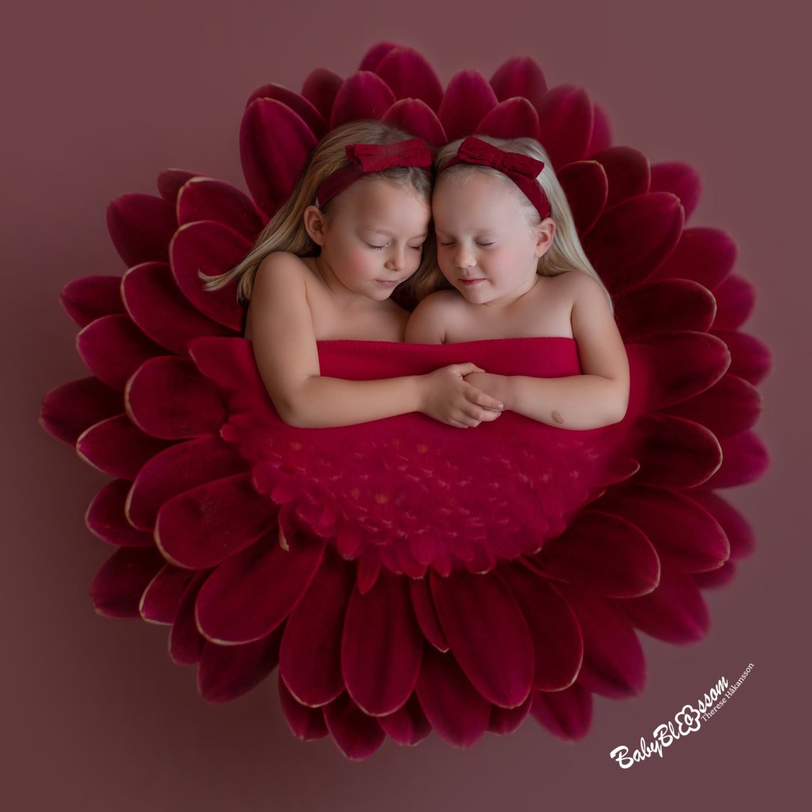 Wrapped in crimson petals, two sisters rest in unspoken harmony. The blossom, rich in color and quiet strength, mirrors their bond — a tender reminder that some connections grow not from words, but from being deeply rooted in each other.