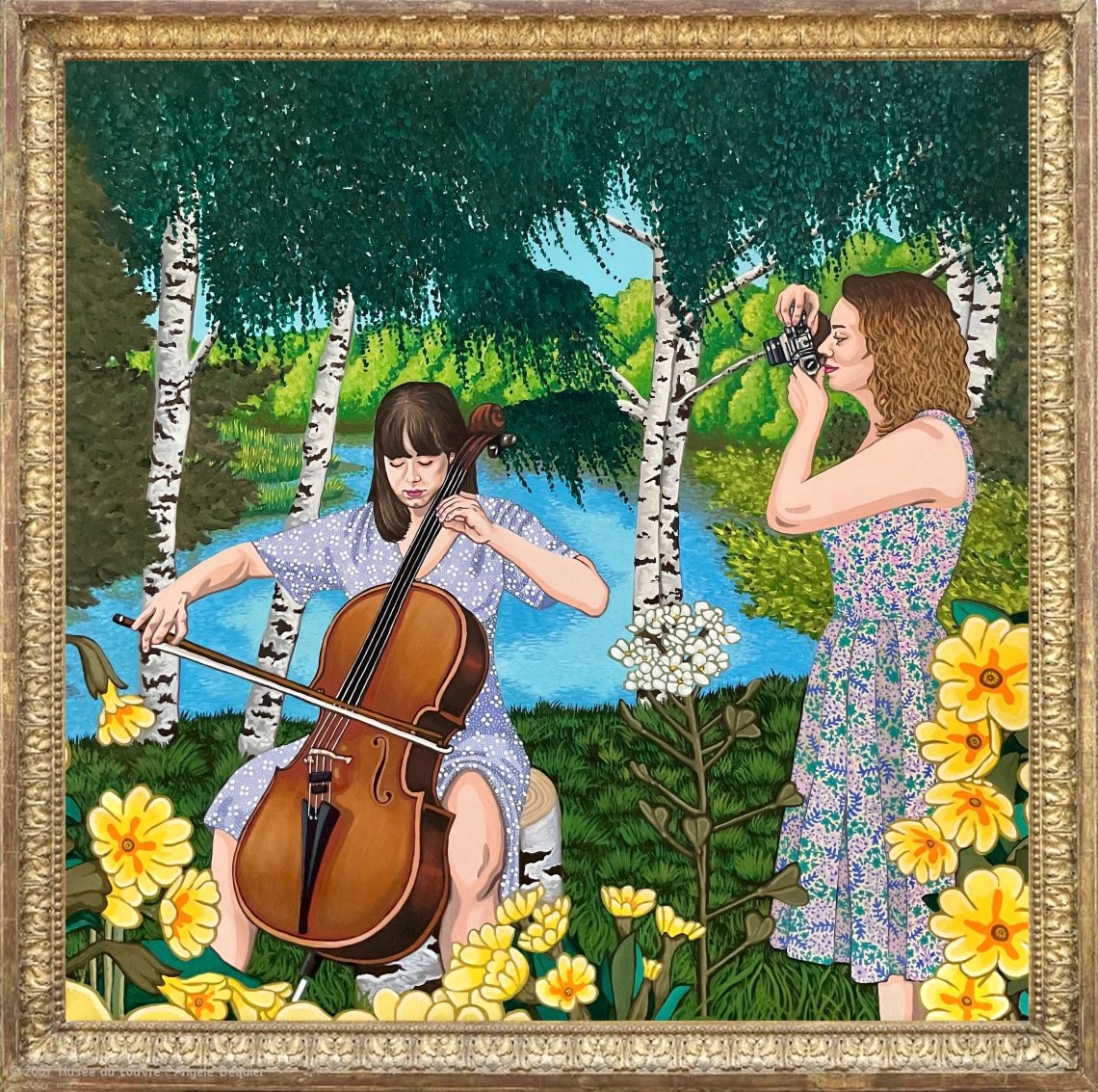 The painting presents an allegory of art in two forms—music and photography—set in a springtime natural scene with birch trees, blooming flowers, a cerulean sky, and a murmuring river. Inspired by the Pre-Raphaelites, it centers on two young women: Barbora Nemcova taking photographs and Eva Cahlova playing the cello, whose parallel creative acts embody harmony between different artistic disciplines and become a visual poem about female talent, intuition, and strength rooted in nature. Rendered in a green-blue-yellow palette, it reflects spring’s freshness and natural beauty, contrasting with today’s superficial aesthetic, reinforcing the message that art cannot be bought—talent is a gift. True art grows from an inner source, like flowers from fertile soil, symbolized by primroses and shepherd’s purse evoking new beginnings, gentleness, and resilience. The woman is shown in deep connection with nature, which serves as both muse and mirror, while the painting stands out for its poetic realism and tribute to authenticity. Instead of luxury, it emphasizes the power of friendship and personal stories, becoming a celebration of feminine artistry and a visual meditation on the essence of creativity—its fragility, strength, and elusiveness. In this sense, the painting is not only an allegory of art, but also of womanhood itself—as a source of life, creativity, and beauty.