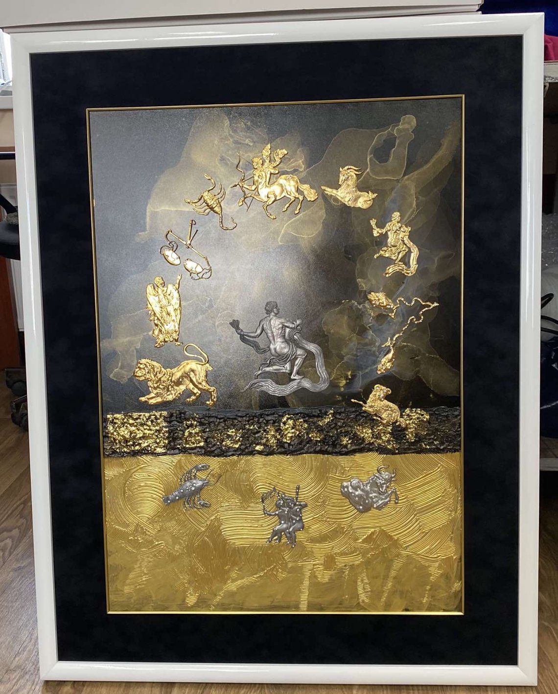Artwork title : Author's panel "Gold and Silver of Destiny" (painting, textural landscape, metal, gilding, silvering, jewelry stones)