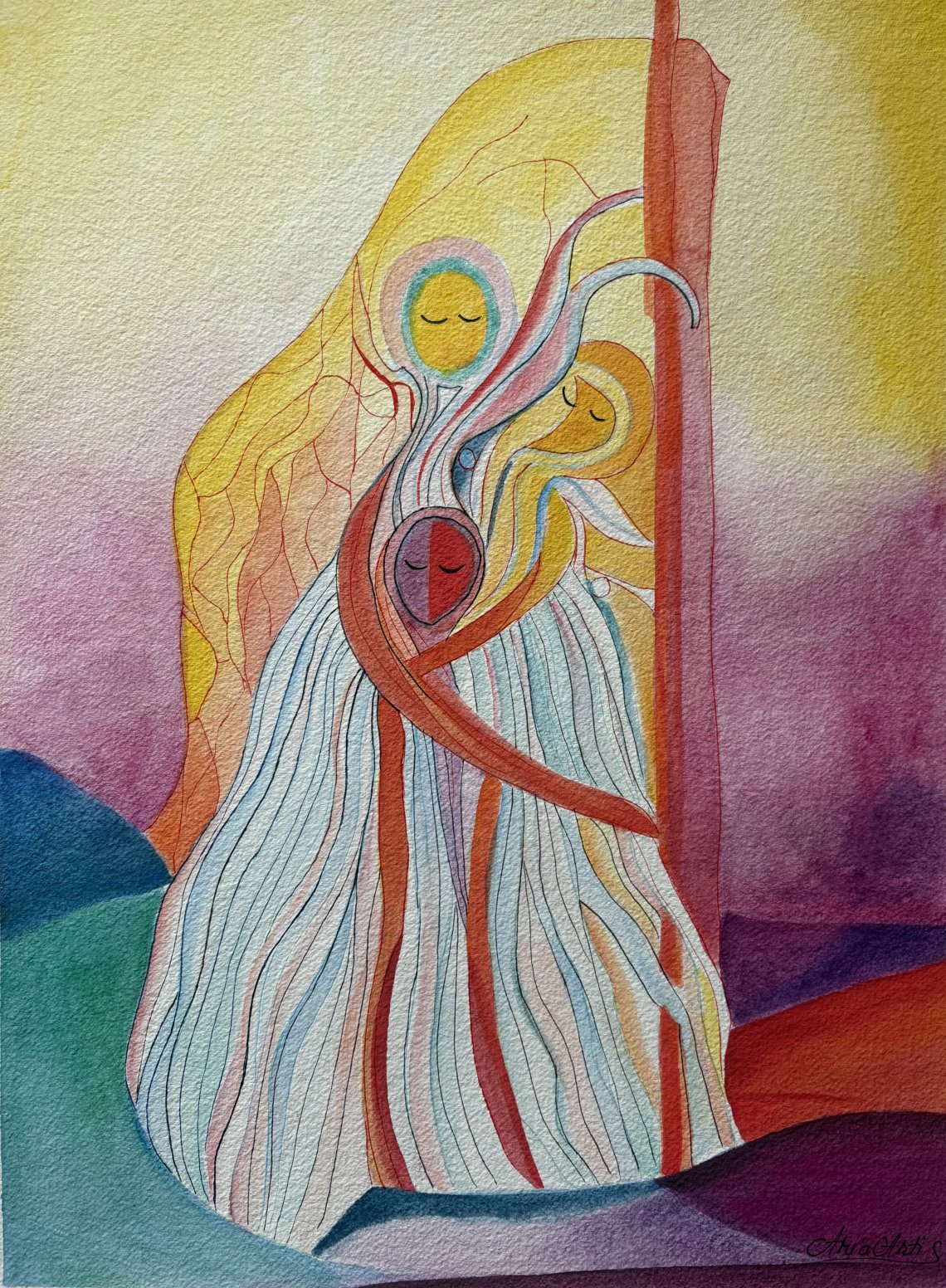 "Mother’s Love" (watercolour on paper, 36x48cm, painted in June 2025) : The painting beautifully expresses the deep bond between a mother and her children—highlighting protection, tenderness, and the peacefulness that true love can bring. This connection is in a fluid, organic form where the souls seem to merge.