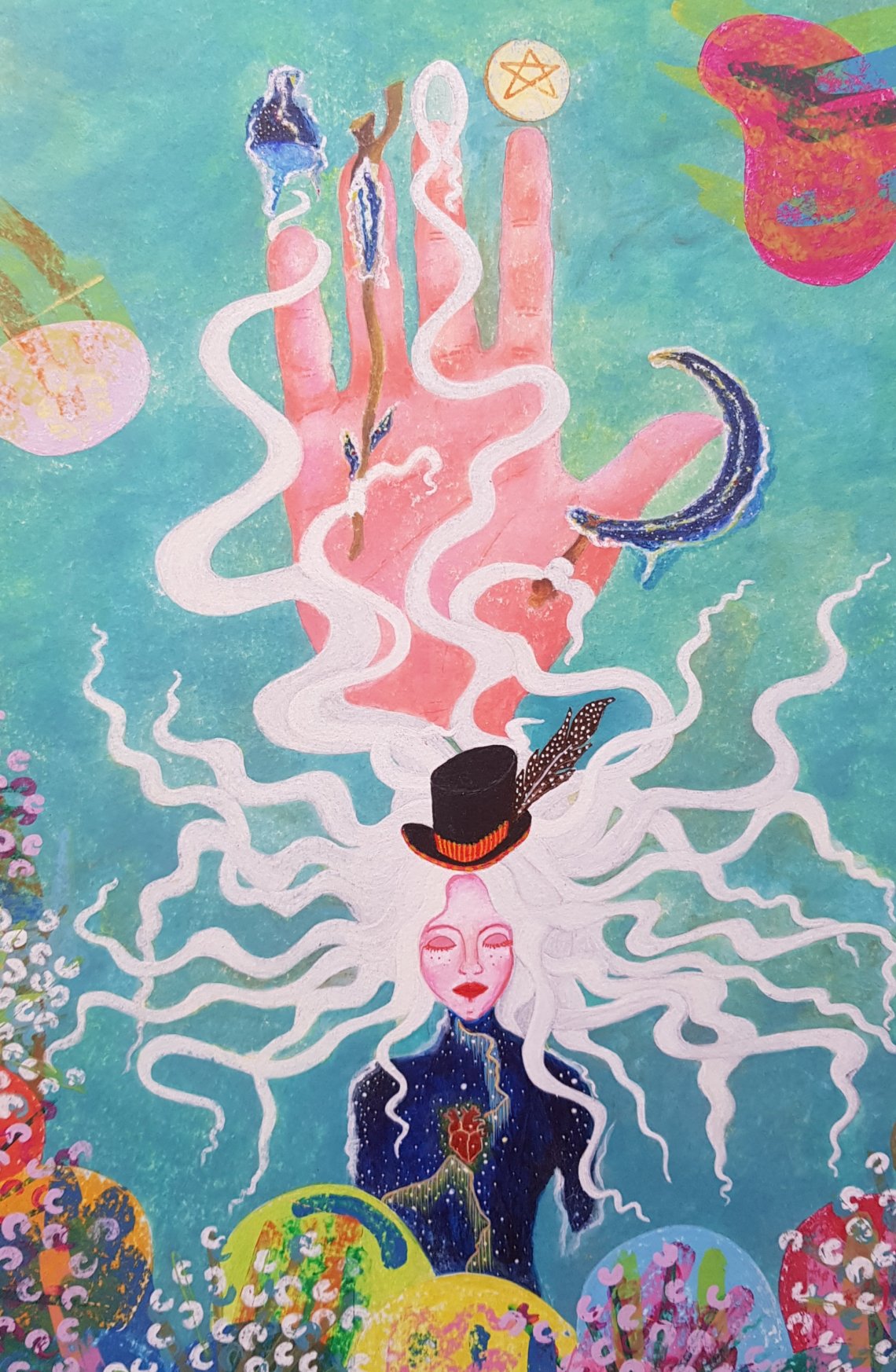 Maga Alchemica fa parte di un opera di 22 Arcani Maggiori dei tarocchi, dipinti a mano, tecnica con pittura acrilica, dimensione A3