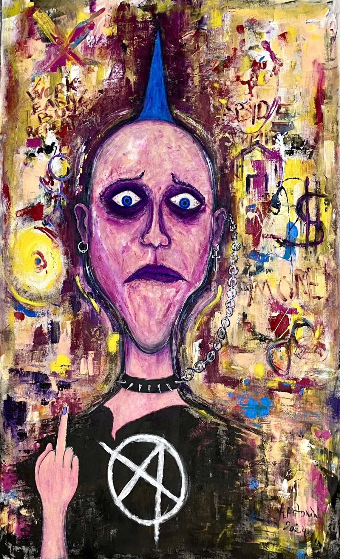 “Le freak c’est chic” (2024, acrilico su tela, 120x200 cm; 47.2x78.7 in) si ribella contro le rotaie della normalità, contro’ lillusione del rifugio di fronte alla complessità della vita. Imposto fin dall'infanzia e continuamente rafforzato dalla cultura dominante, questo spietato condizionamento di massa appiattisce la ricchezza delle complesse e multidimensionali caratteristiche individuali nell'ottusità di anonime sagome scure.