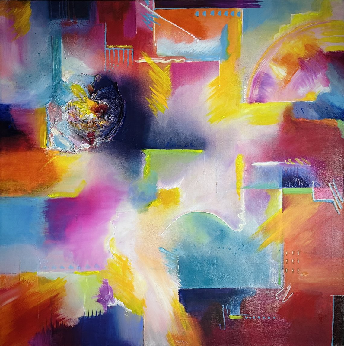 Tecnica mista con acrilici ,matite ,garza su tela 100cm x100cm 2024 Con un forte contrasto tra ombra e luce, evoco emozioni profonde e riflessioni sulla dualità della vita. I toni scuri dominano la mia scena, creando un'atmosfera di mistero e introspezione, mentre fasci di luce emergono in modo incisivo, simboleggiando speranza e rivelazione. La mia composizione è caratterizzata da pennellate fluide e dinamiche, che conferiscono movimento e vitalità all'opera. L'uso sapiente del colore e della luce invita chi osserva a esplorare le proprie emozioni e a trovare la propria luce interiore anche nei momenti di buio. Faccio parte di un nuovo movimento artistico che sta nascendo a Torino Basato sull’uso del colore per contrastare questo terribile periodo storico incentrato su guerre e contatti umani distanziati , attraverso i pixel di uno schermo…