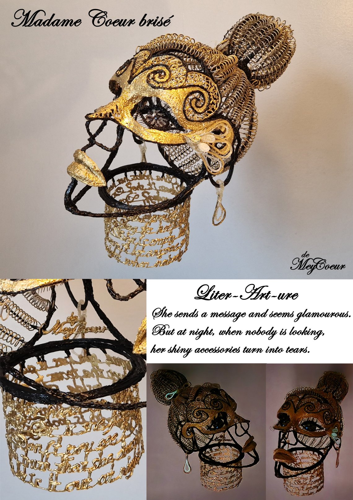 "Madame Coeur brisé" seems flawless and shiny, but at night, when nobody is looking, she starts to cry and her beautiful shiny accessories turn into tears. She seems content and perfect, but actually, she is empty inside.
