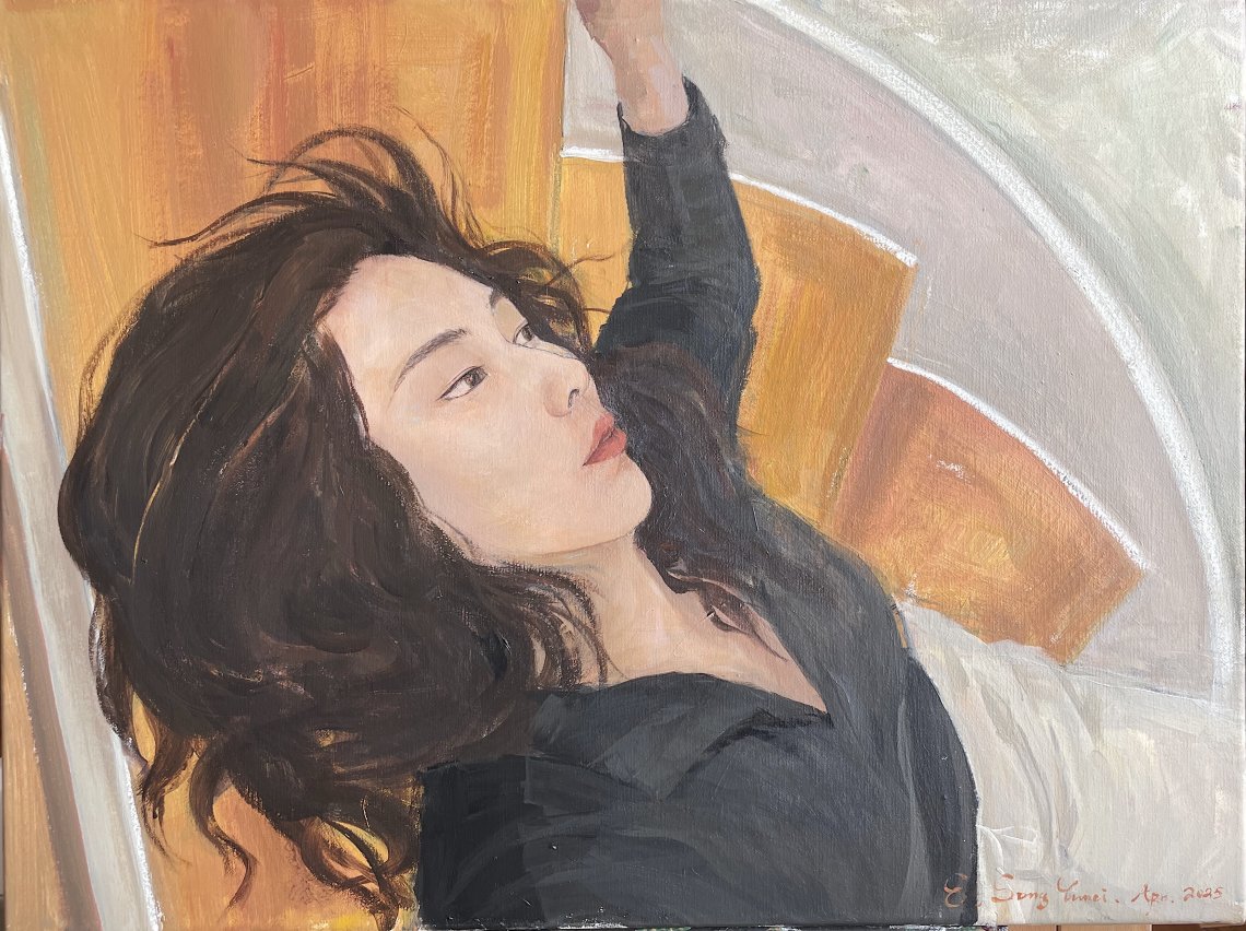 This painting is a self-portrait of the artist Emma herself, in which she lies on the stairs, her brown hair scattered haphazardly, her expression is thoughtful, her lazy demeanor and the colors behind her become a hazy beauty, highlighting her own beauty and temperament in the eyes of the artist.