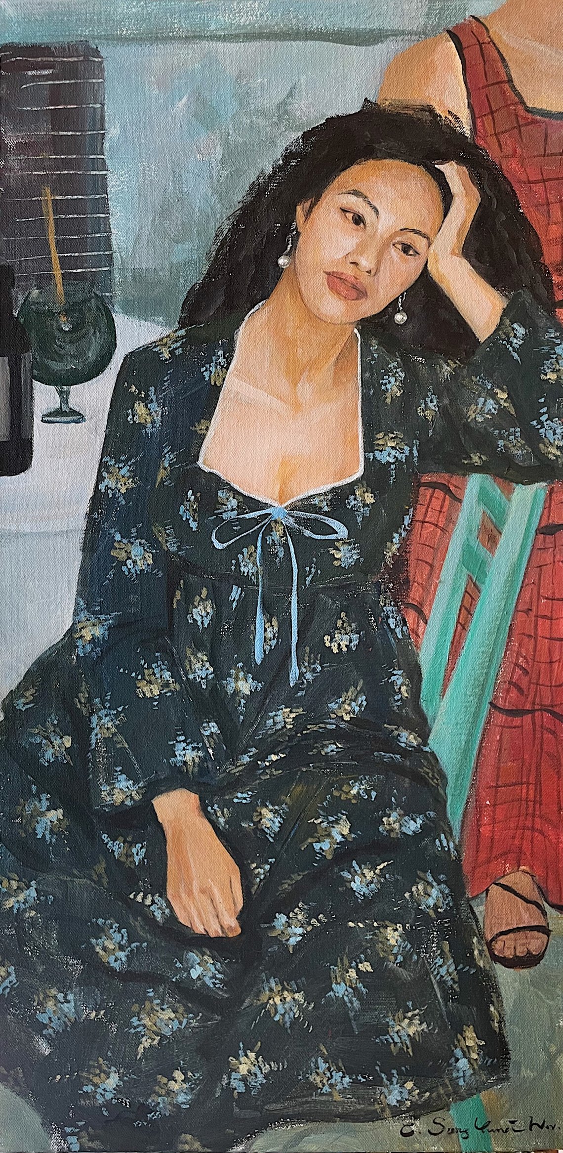 This painting depicts a woman in a floral dress, leaning in a room at night, her black curly hair and bright eyes set off even brighter, brown skin and beautiful facial features reflect the unique mysterious temperament of Monica (the woman in the painting), like a pearl in the dark night, shining with the vitality of women.