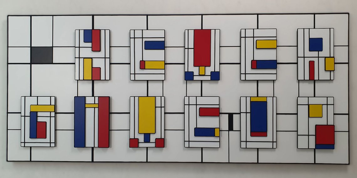 Il Codice Invisibile is a work that merges visual language with textual structure, creating a hidden message encoded within abstract forms. Each colorful block contains a letter, constructed through a rhythm of rectangles, lines, and primary colors — red, yellow, and blue — in accordance with the principles of the De Stijl movement.
