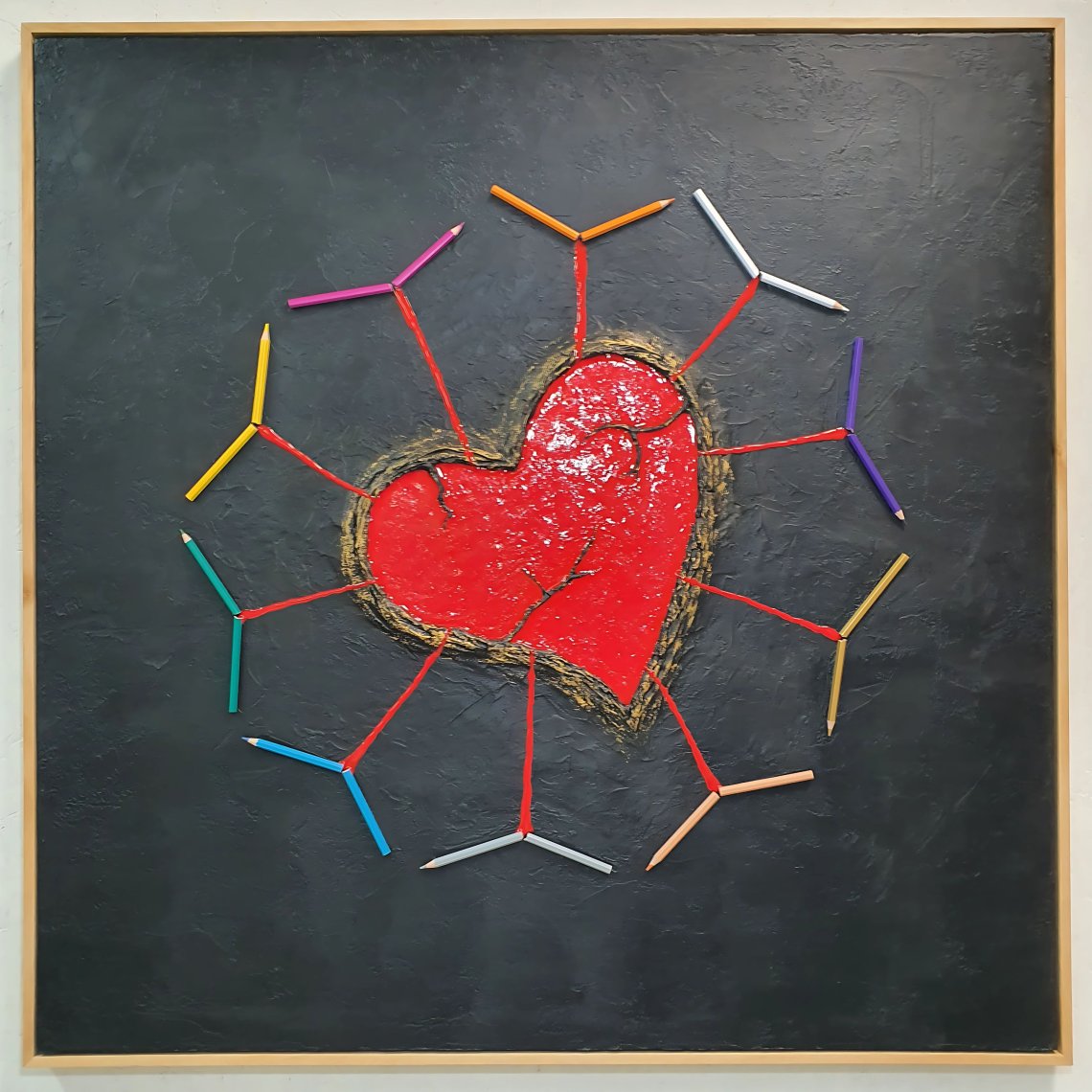 Each pencil – in a different color – has been intentionally snapped and connected to the heart by thin red lines of resin. They "bleed," shaping the heart itself. These broken pencils symbolize emotional, personal, and social wounds — each from a different experience, yet together forming one universal heart.