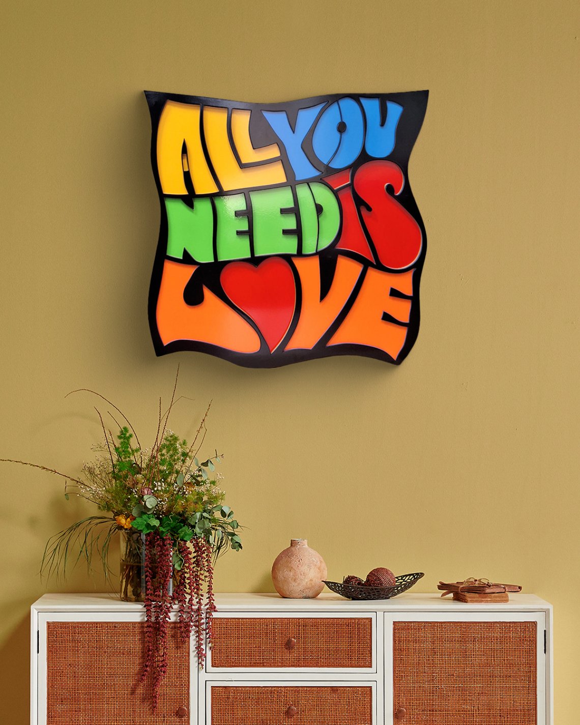 Un’opera che vibra. Vibra come la voce dei Beatles nel ’67, come le piazze gremite di sogni, come le pareti dipinte di libertà e rivoluzione.In questa versione, il messaggio diventa materia viva: ogni lettera si deforma, si colora, si allunga come un grido gentile lanciato nell’aria.
